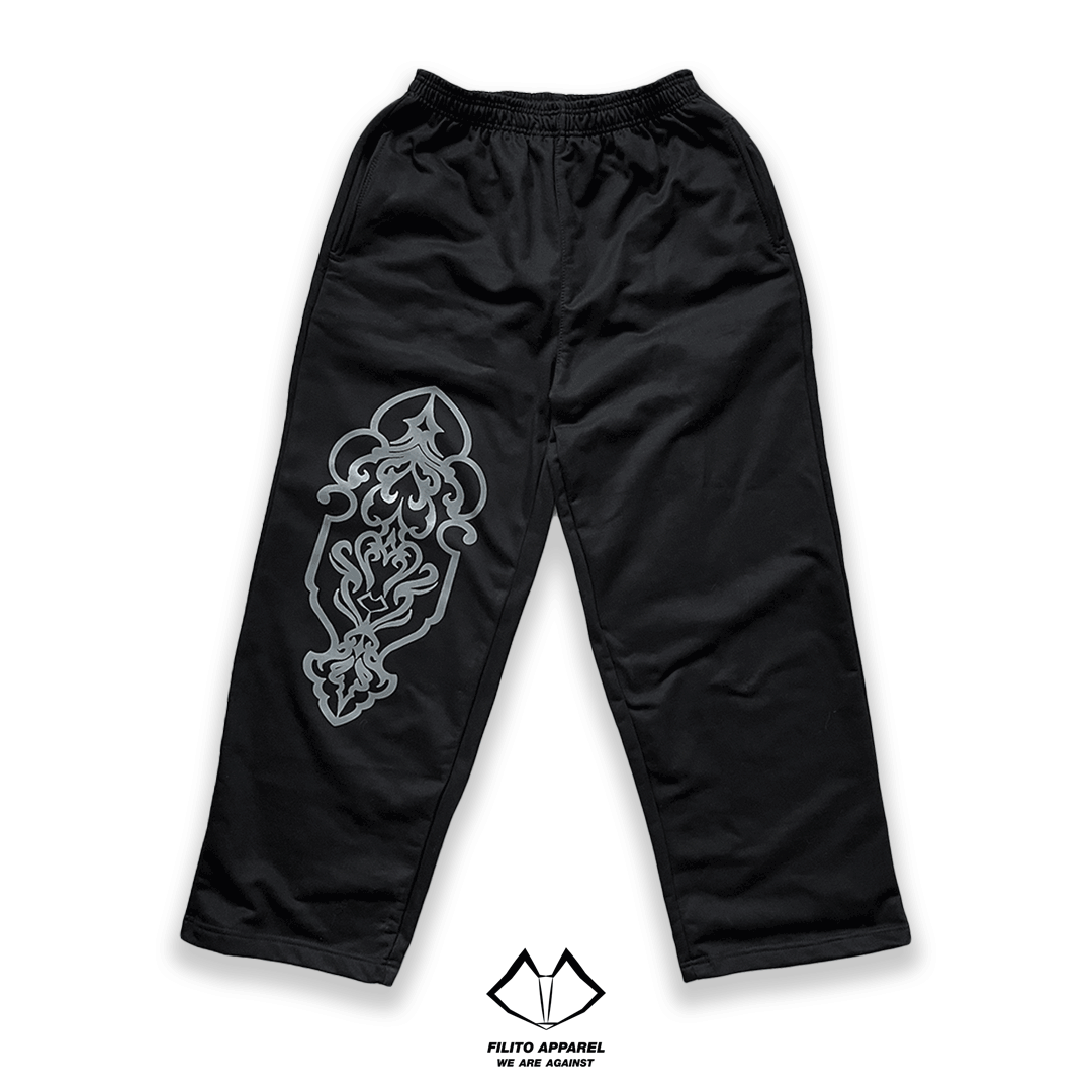 Buzo baggy de calce holgado negro de algodón y estampado color gris oscuro con serigrafía adelante de la prenda. Etiqueta interior serigrafiada para evitar contacto.